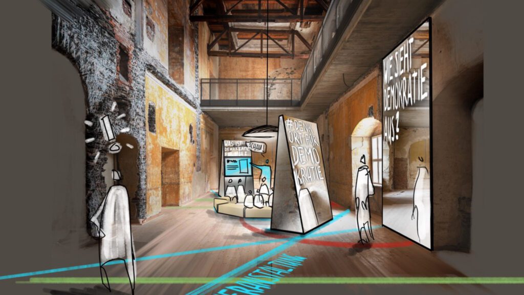 Thüringen ist reich an Schlössern und Burgen, mehr als 500 gibt es im Freistaat. Das Schloss Schwarzburg, Stammhaus der Fürsten von Schwarzburg-Rudolstadt, blickt auf eine spannungsgeladene Geschichte. Im Jahr 1919 unterzeichnete Friedrich Ebert in Schwarzburg die Weimarer Verfassung; rund 20 Jahre später, im Dritten Reich, wurde das Hauptgebäude der barocken Anlage bis zur Unkenntlichkeit verwüstet, weil es zu einem Reichsgästehaus umgebaut werden sollte. Nach 1945 stand das Schlossensemble lange leer und verfiel. Schloss Schwarzburg soll mit seiner widersprüchlichen Geschichte ein lebendiger Denkort der Demokratie werden und in Partnerschaft mit dem „Haus der Demokratie in Weimar“ die demokratischen Grundlagen unserer Gesellschaft vermitteln. 2016 hatte die IBA Thüringen in Abstimmung mit der Stiftung Thüringer Schlösser und Gärten eine entsprechende Machbarkeitsstudie und 2017 ein Drehbuch für Schloss Schwarzburg als Denkort der Demokratie in Auftrag gegeben. 2017 wurde Schloss Schwarzburg ein Projekt der Internationalen Bauausstellung (IBA) Thüringen und in das Bundesprogramm der Nationalen Projekte des Städtebaus aufgenommen. Damit konnte die Finanzierung sichergestellt werden. Seitdem wurden die Planung und der Ausbau von zwei Räumen in Regie der Stiftung Thüringer Schlösser und Gärten in Kooperation mit der IBA Thüringen und dem Förderverein Schloss Schwarzburg – Denkort der Demokratie e.V. sowie der Gemeinde Schwarzburg aktiv betrieben. Geplant war ein sukzessiver Ausbau und eine schrittweise Nutzung (und damit keine Rekonstruktion des Ursprungszustands). Für politisch Interessierte, für Initiativen und Vereine und letztlich für Jung und Alt entsteht so an einem historisch bedeutsamen Ort eine (Begegnungs-)Stätte für Projektarbeit und demokratische Bildung – mitten im ländlichen Raum Thüringens.