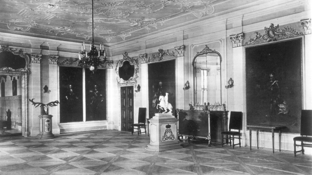 Abstammung der Schwarzburger verwiesen wurde, die im Rahmen der Erhebung der Grafen in den Reichsfürstenstand 1710 von besonderer Bedeutung war. Zahlreiche Kaiser-und Königporträts schmücken bis heute die Decke und die Laterne des Saals. In die