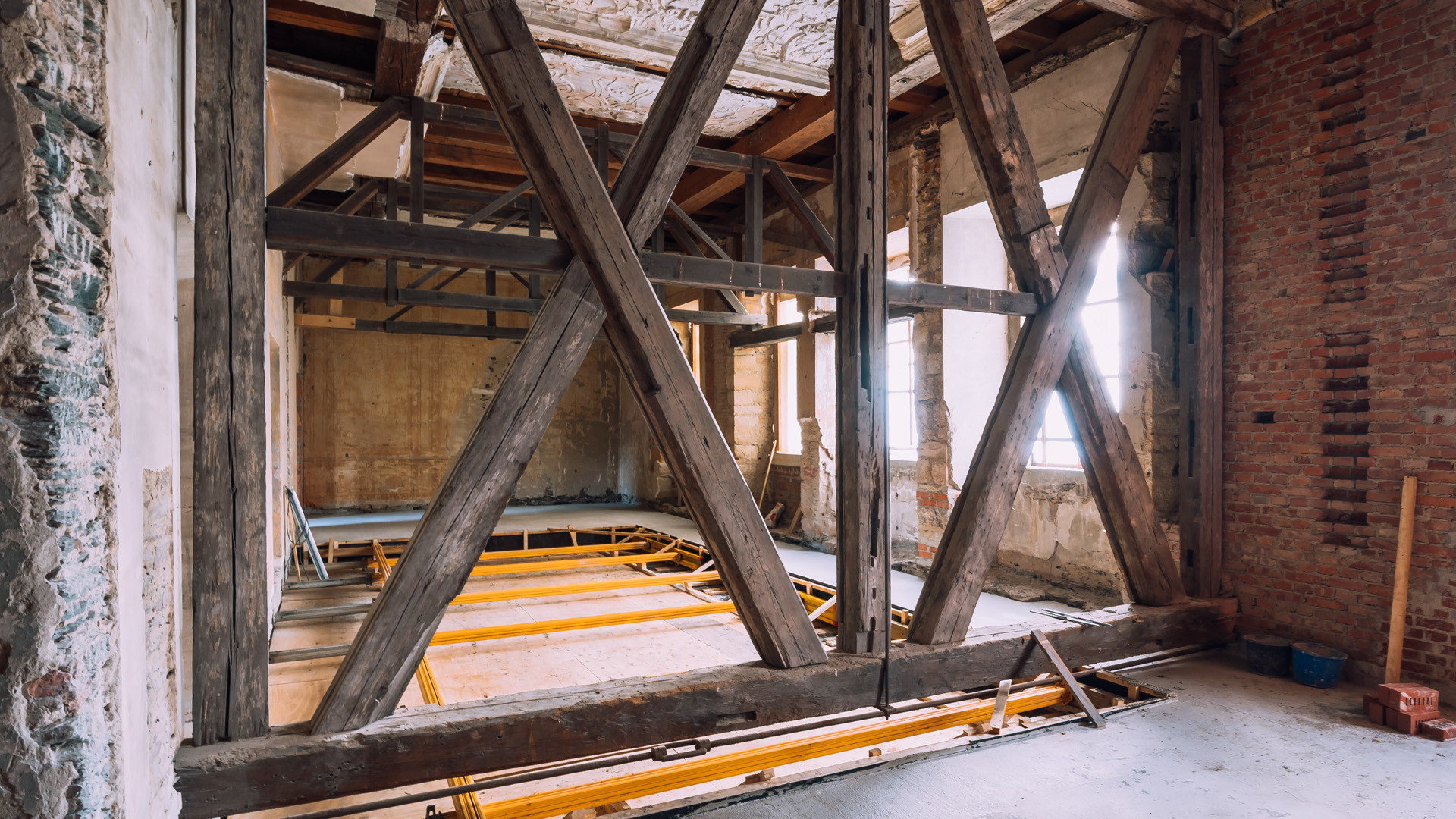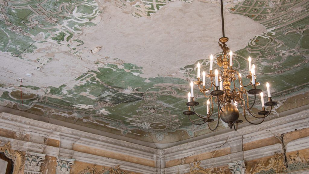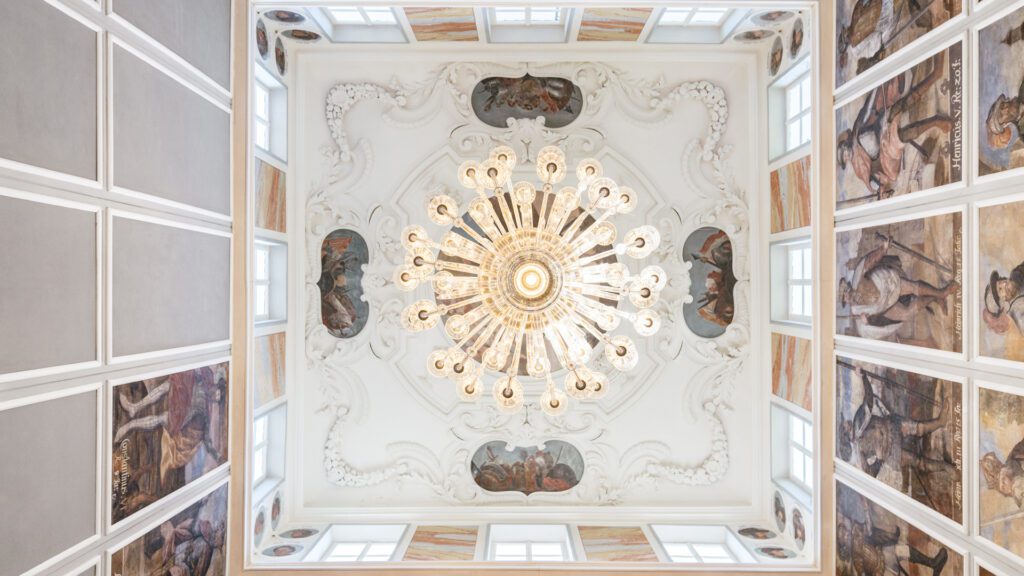 Es ist ein sonniger Tag Mitte Juni 2021. Im Schloss-Hauptgebäude von Schloss Schwarzburg, der ehemaligen Sommerresidenz der Fürsten von Schwarzburg-Rudolstadt, laufen die letzten Arbeiten vor der feierlichen Eröffnung des Emporensaals und des Ahnensaals im Hauptgebäude. Im Ahnensaal – dem ehemaligen Hauptsaal des Schlosses – steht schon ein Raumgerüst bereit. An diesem Tag kehrt ein ganz besonderes Stück der ehemaligen Innenausstattung ins Schloss zurück – ein über 100 Jahre alter Kronleuchter aus Messing. Mit Seil und jeder Menge Muskelkraft wird der stolze 40 Kilogramm schwere Leuchter in die Höhe gehievt und aufgehängt. Der Kronleuchter hat damit an seinen Platz in der Mitte der Stuckdecke aus dem frühen 18. Jahrhundert zurückgefunden.