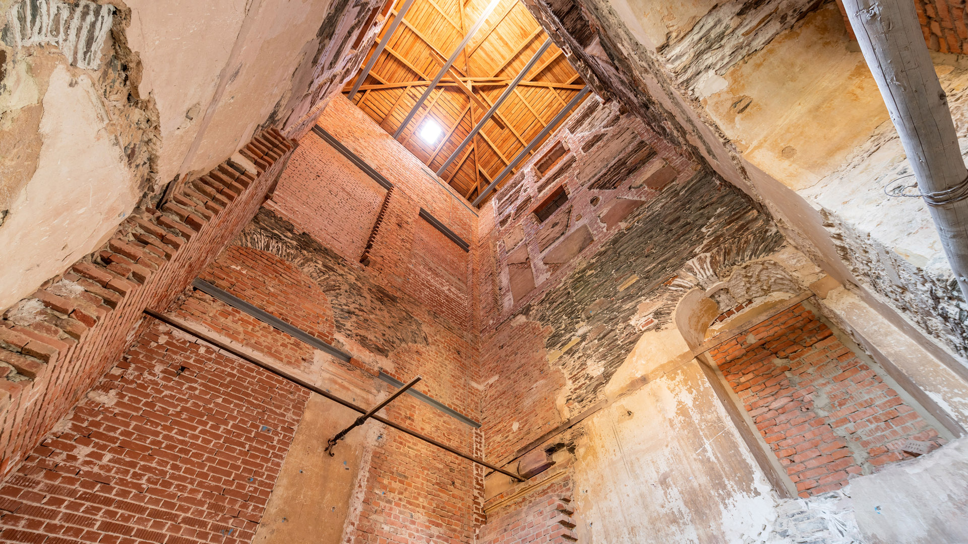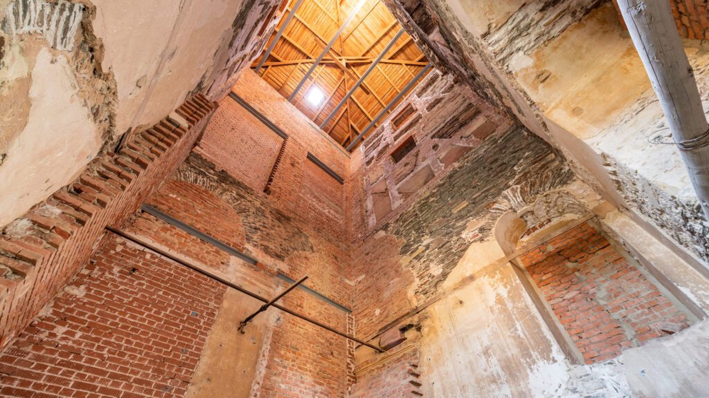 Das hatte allerdings Auswirkungen. Durch den Abriss des Kirchenflügels wurden ihm seine stützenden Flanken genommen. Außerdem bereitete ihm sein eigenes Mauerwerk große Schwierigkeiten. Beim Turmbau wurden zahlreiche unterschiedliche Materialien von geringerer Qualität verwendet, die aus dem vermutlich eher kleinen Baubudget finanziert werden konnten. Und auch der Außenputz fehlte während der letzten Jahrzehnte, weshalb es durch Feuchtigkeit und Frost im Verlauf der Jahre zu Rissen und Fehlstellen im Mauerwerk kam. Als ob das alles nicht schon genug wäre, zerstörte ein Brand, ausgelöst durch eine Silvesterrakete, in den 1980er Jahren die Dachhaube des Turms. Da beim Bau des Turms wasserlösliche gipshaltige Mauermörtel verwendet wurden, zog auch das rettende Löschwasser das Mauerwerk in Mitleidenschaft. Dies führte dazu, dass der Turm zwischen 2015 und 2021 mit großem denkmalpflegerischem Aufwand stabilisiert und saniert werden musste. Um das Mauerwerk vor Witterungseinflüssen zu schützen und einen Eindruck von der einstigen Wirkung zu vermitteln, wurde die Oberfläche durch einen speziellen Putz verschlossen.