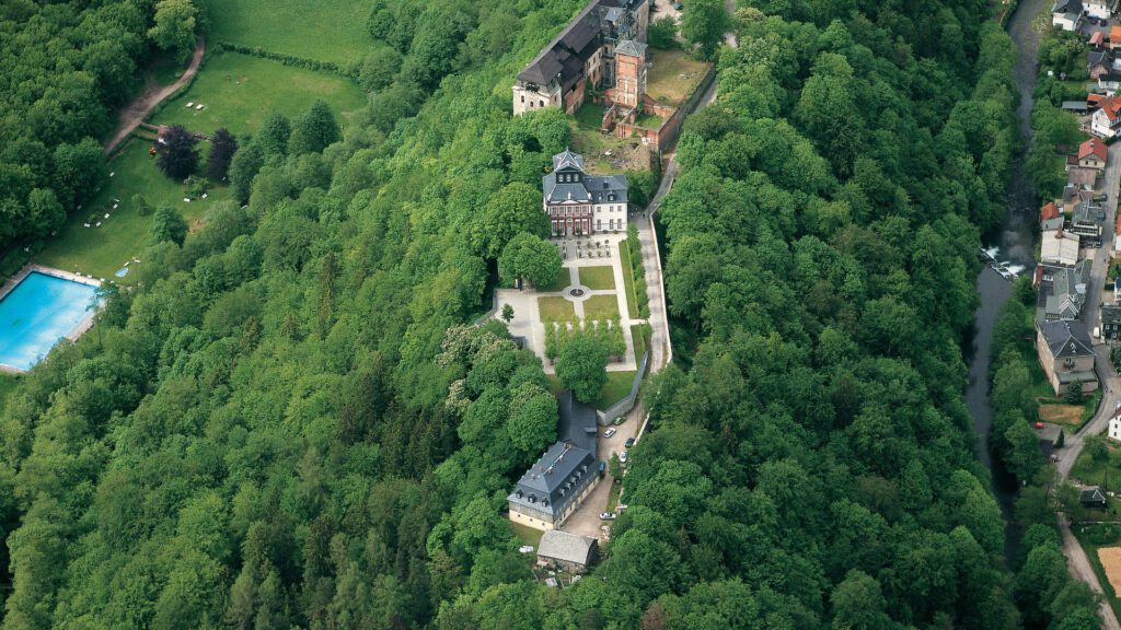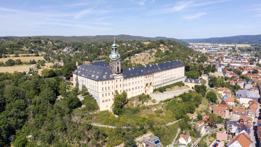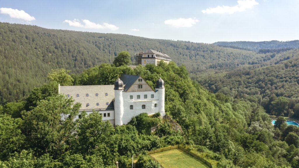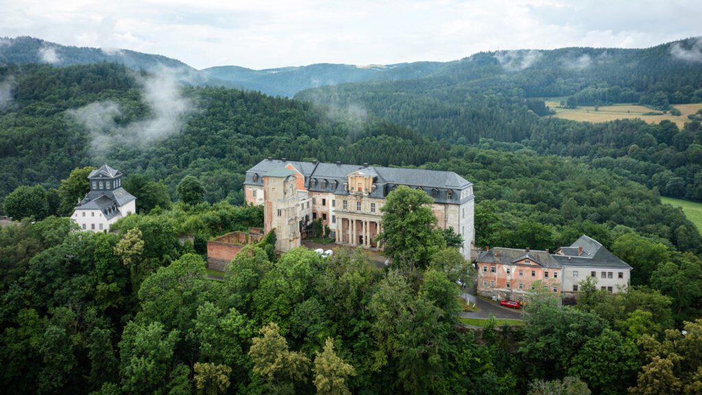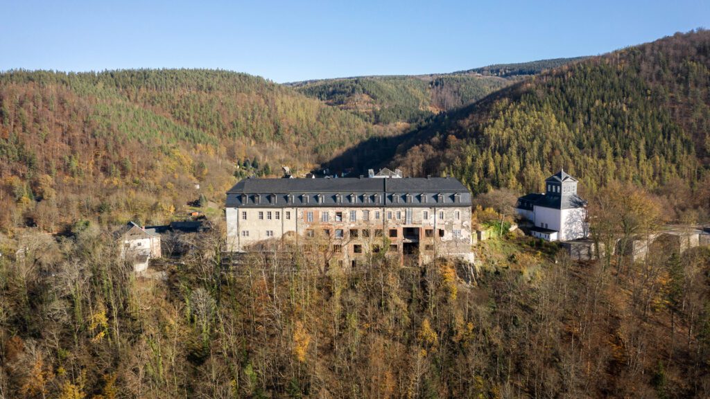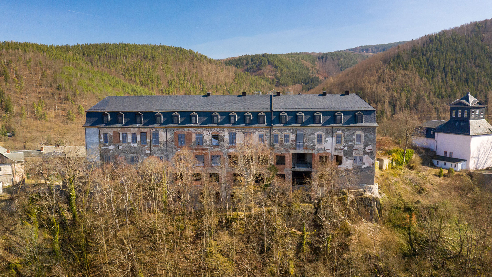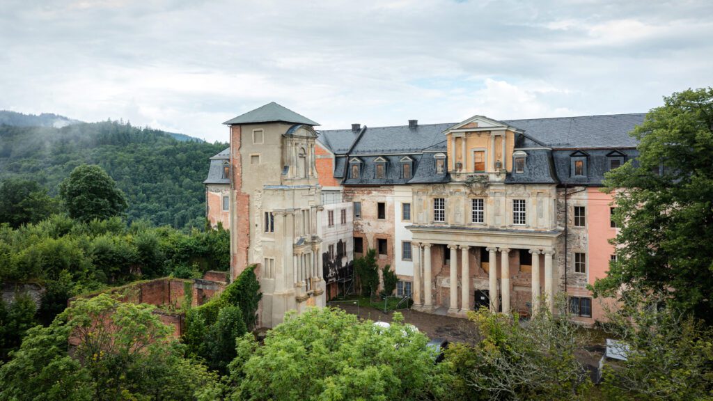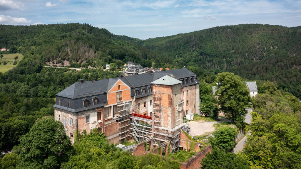 Als Denk- und Geschichtsort ist Schloss Schwarzburg ein echtes Schwergewicht. Die Anlage hat ihre Ursprünge im Mittelalter als Stammsitz der Grafen von Schwarzburg-Rudolstadt. Im Zusammenhang mit der Erhebung der Dynastie in den Reichsfürstenstand zu Beginn des 18. Jahrhunderts wurde die frühere Burg zum Barockschloss mit Hauptgebäude, Schlosskirche, Kaisersaalgebäude und Zeughaus mit Schauwaffensammlung ausgebaut. Die Anlage diente der Repräsentation des Herrschaftsanspruchs der um ihre Souveränität und Reichsunmittelbarkeit ringenden Dynastie. Nach 1918 behielt die abgedankte Familie Wohnrecht auf Schloss Schwarzburg. In den 1940er Jahren begannen die Nationalsozialisten mit dem Umbau zu einem Reichsgästehaus. Als der Plan 1942 aufgegeben wurde, blieb die Anlage als Bauruine mit schwersten Schäden und Verlusten zurück. Torhaus, Schlosskirche und ein weiterer Schlossflügel waren abgerissen, der Kaisersaal beschädigt, das Hauptgebäude fast vollständig entkernt und seiner raumkünstlerischen Ausstattung beraubt.